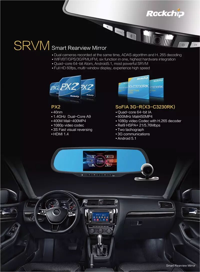 在今年10月的香港秋季电子展上,Rockchip就展示了几款基于PX2方案的车载中控产品。同时还展示了一款基于其最新PX3芯片方案的智能倒车后视镜。